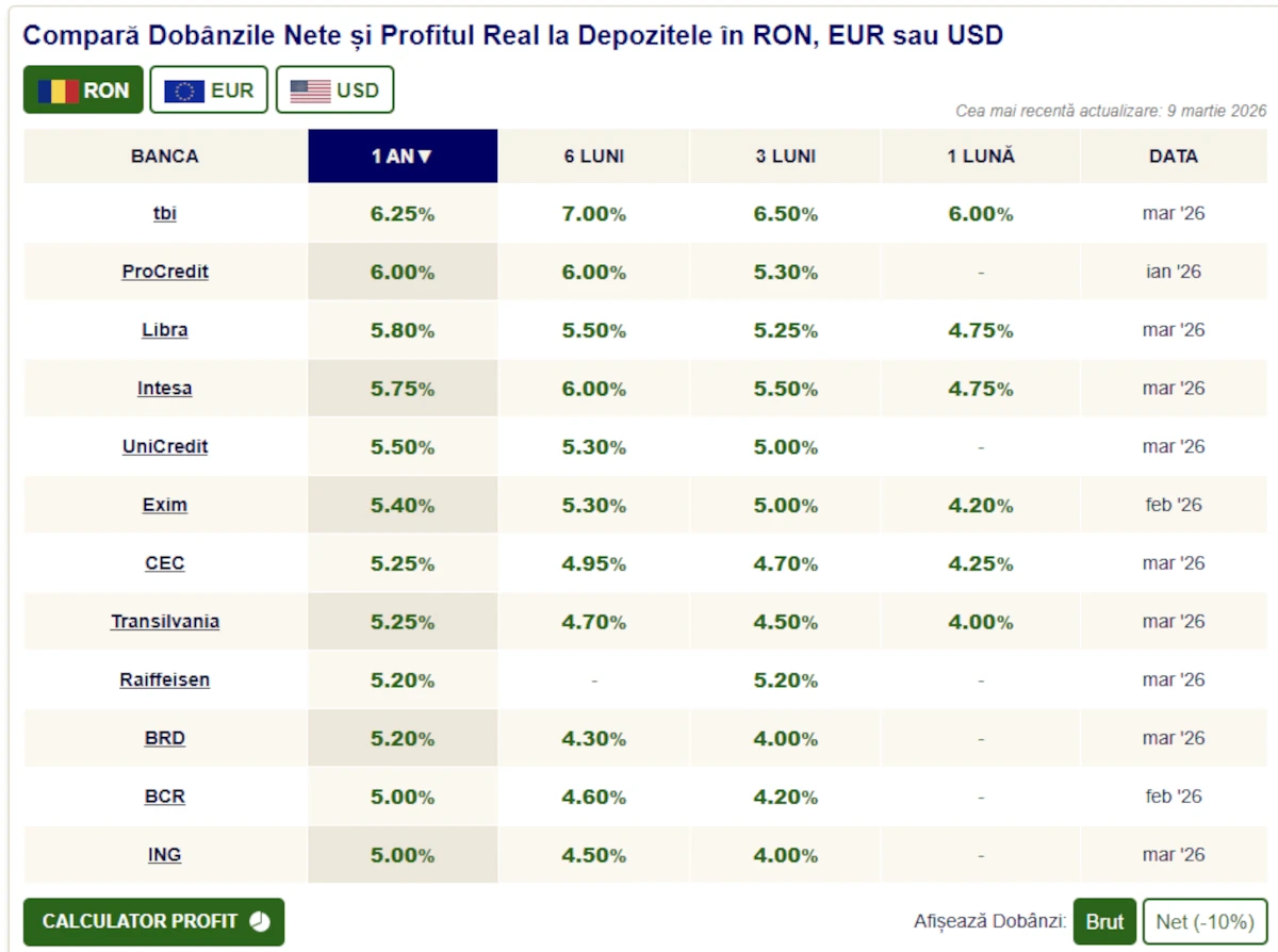 Top Dobânzi 9 Martie 2026: tbi bank urcă la 7% pe an. Unde obții cel mai mare profit?