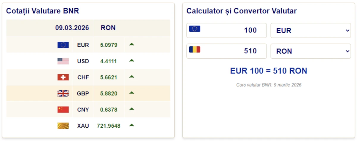 - EUR: 5.0979 RON (↑)