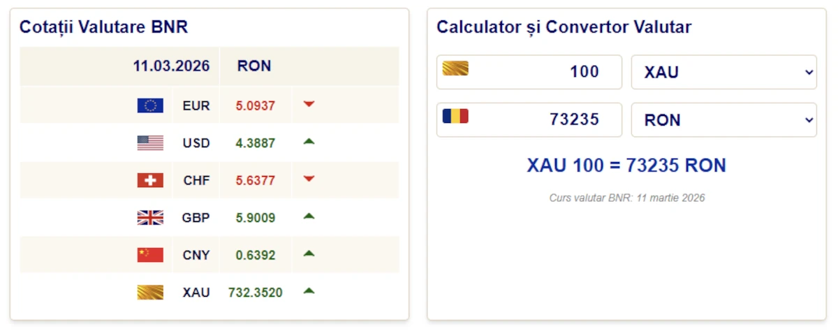Ședința BNR de astăzi, 11 martie 2026, a adus o schimbare de dinamică pe piața financiară. Dacă în zilele trecute atenția a fost concentrată pe pragul psihologic al Euro, astăzi vedeta incontestabilă este Aurul (XAU), care a înregistrat o creștere masivă.