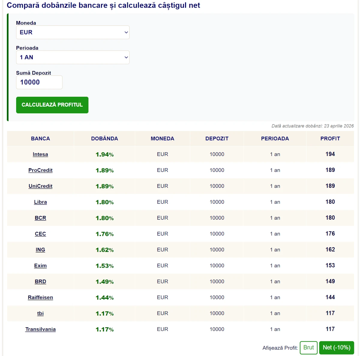 | Loc | Banca | Dobândă Netă (%) | Câștig NET (EUR) |